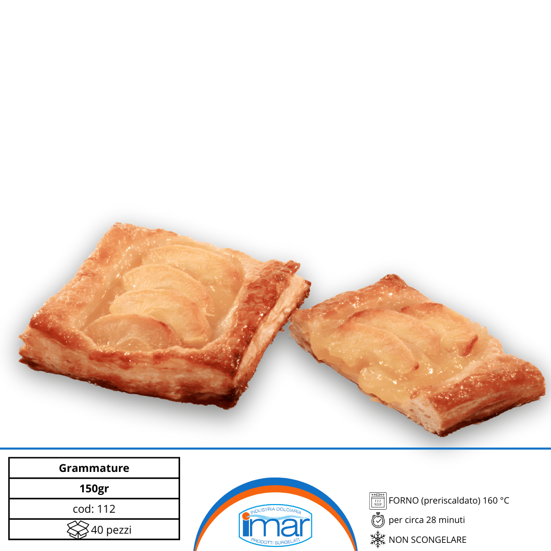 Sfoglia fragrante arricchita con fette di mele fresche, adagiate su un morbido letto di crema alla vaniglia e decorata con zucchero semolato. Un connubio perfetto tra la croccantezza della pasta sfoglia e la dolcezza della crema e della frutta.
